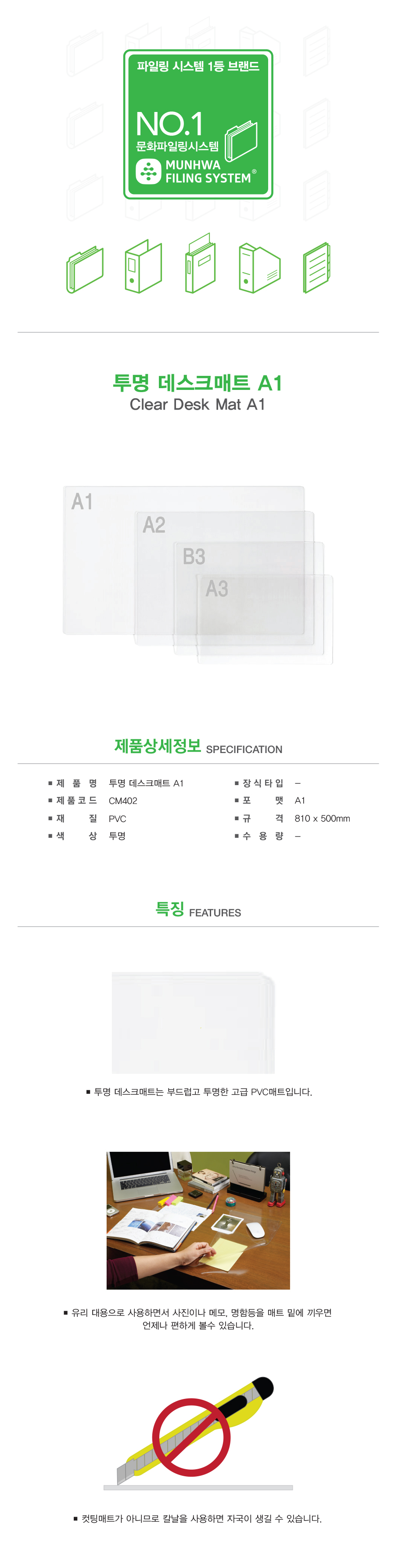투명 데스크매트는 부드럽고 투명한 고급 PVC매트입니다. 책상위에 유리대용으로 사용하며 필기감이 부드럽고 미끄러지지 않습니다. 유리 대용으로 사용하면서 사진이나 메모, 명함등을 매트 밑에 끼우면 언제나 편하게 볼수 있습니다. 컷팅매트가 아니므로 칼날을 사용하면 자국이 생길 수 있습니다. A1, A2, B3, A3 총 4가지 규격으로 생산되고 있습니다.
